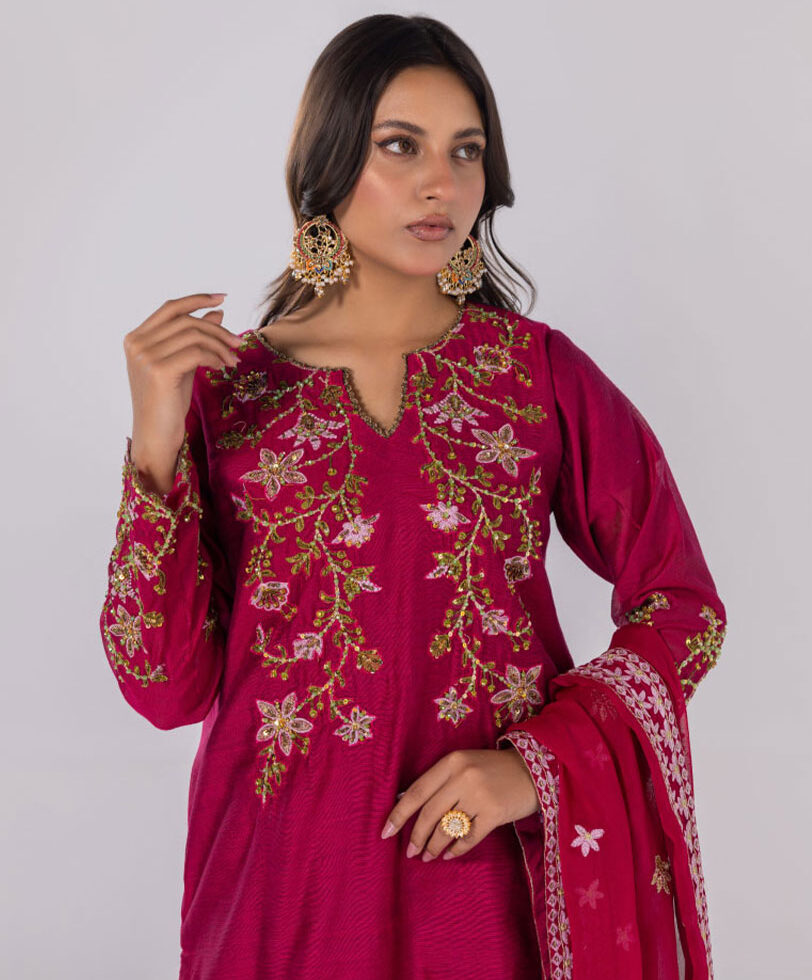 3 PCS |Luxury Khaadi Silk Rose Fuschia brodé aux fils dorés, orné de multiples perles, sublimé par des détails élégants, accompagné d’un pantalon et d’un dupatta brodé aux motifs fleuris.