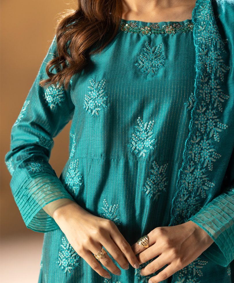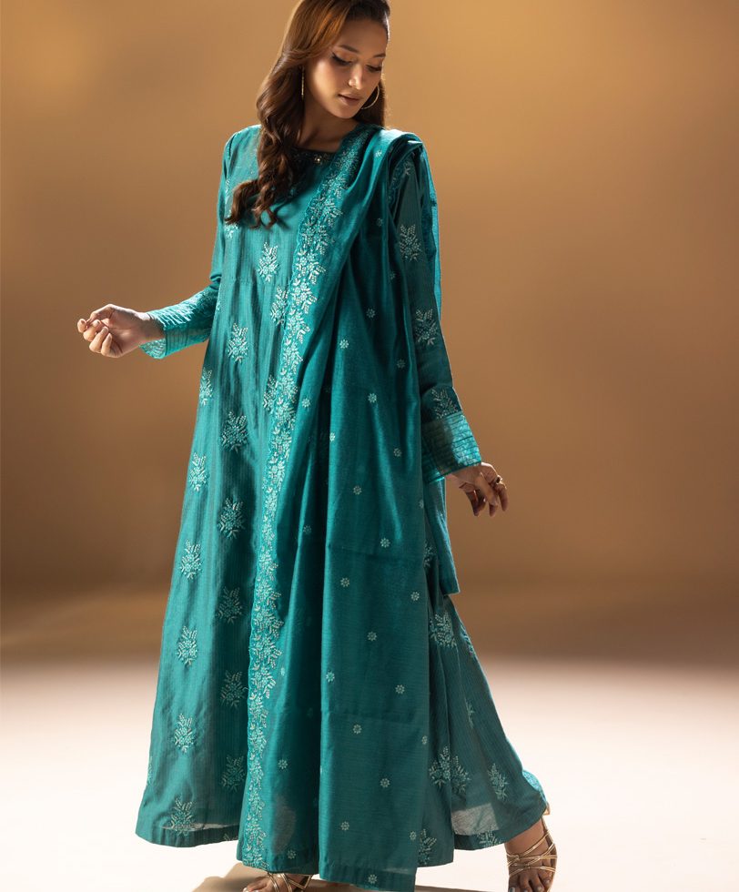Composé d’une robe fluide, d’un pantalon assorti et d’un dupatta léger, ce modèle incarne l’harmonie parfaite entre modernité et tradition.