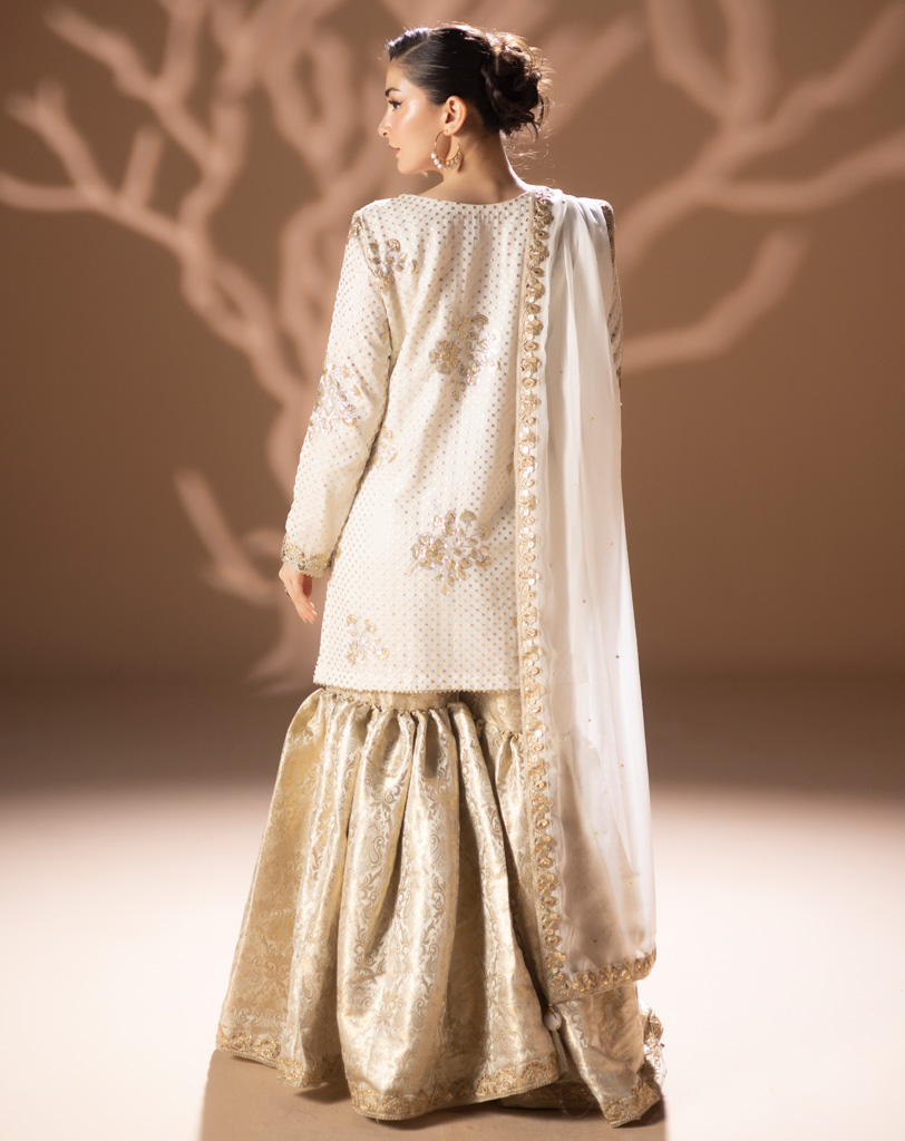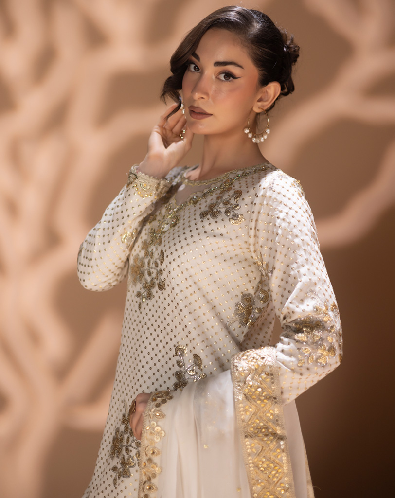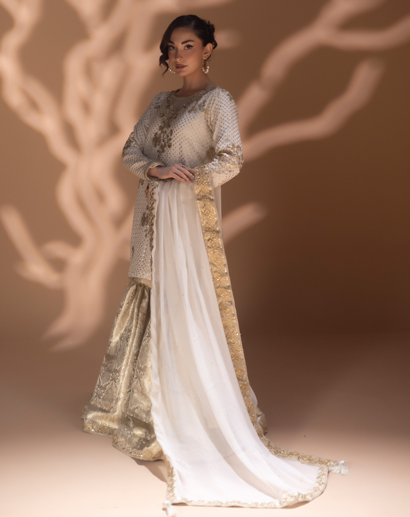 3 PCS | Sublime et lumineux, cet ensemble blanc doré issu de la Collection NIGAR | نگار signé OneMillionDRESS met à l’honneur la couture pakistanaise dans toute sa finesse.