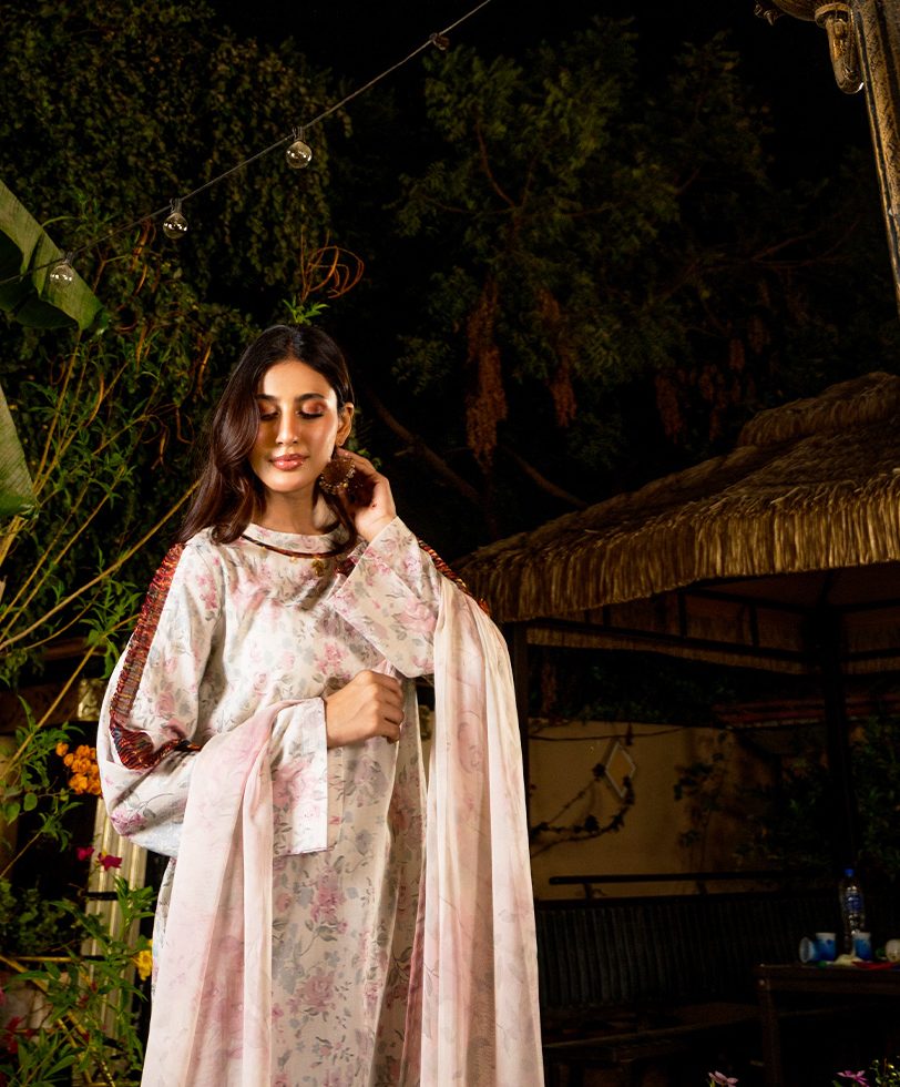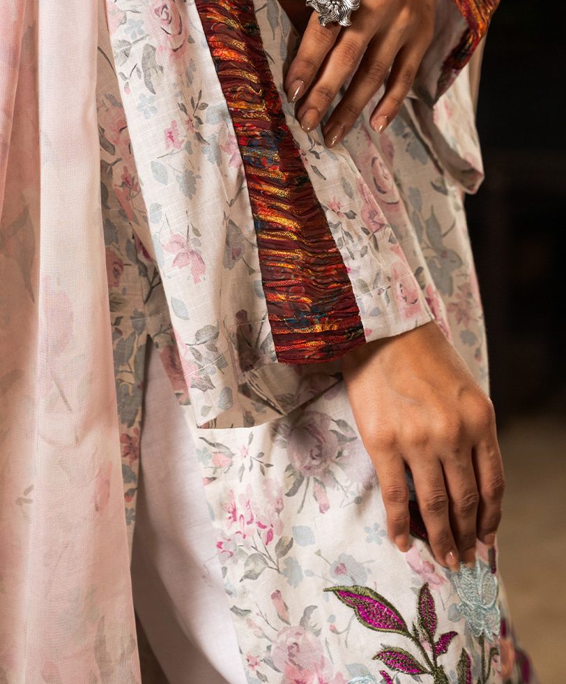 3 PCS | Ensemble aux motifs fleuris avec une finition d’organza au niveaux des manches, un pantalon et un dupatta.
