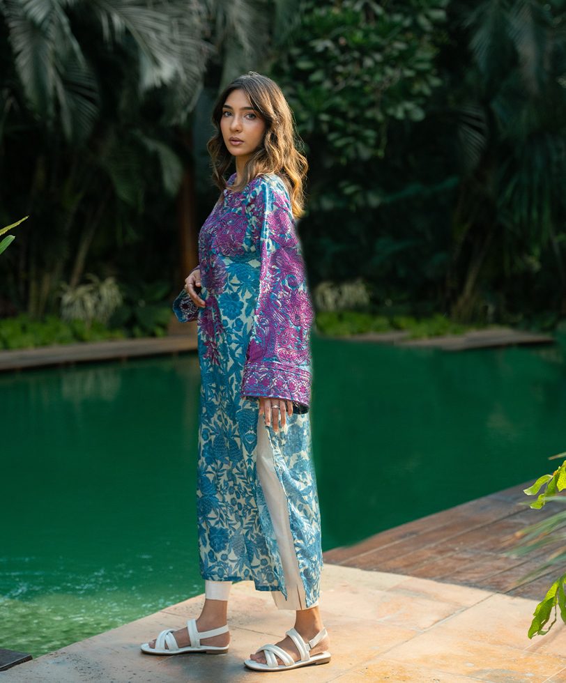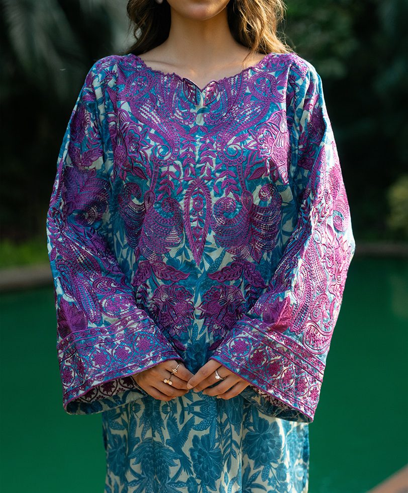 3 PCS | Ensemble aux motifs fleuris compété d’une broderie faite à la main, un pantalon et un dupatta.
